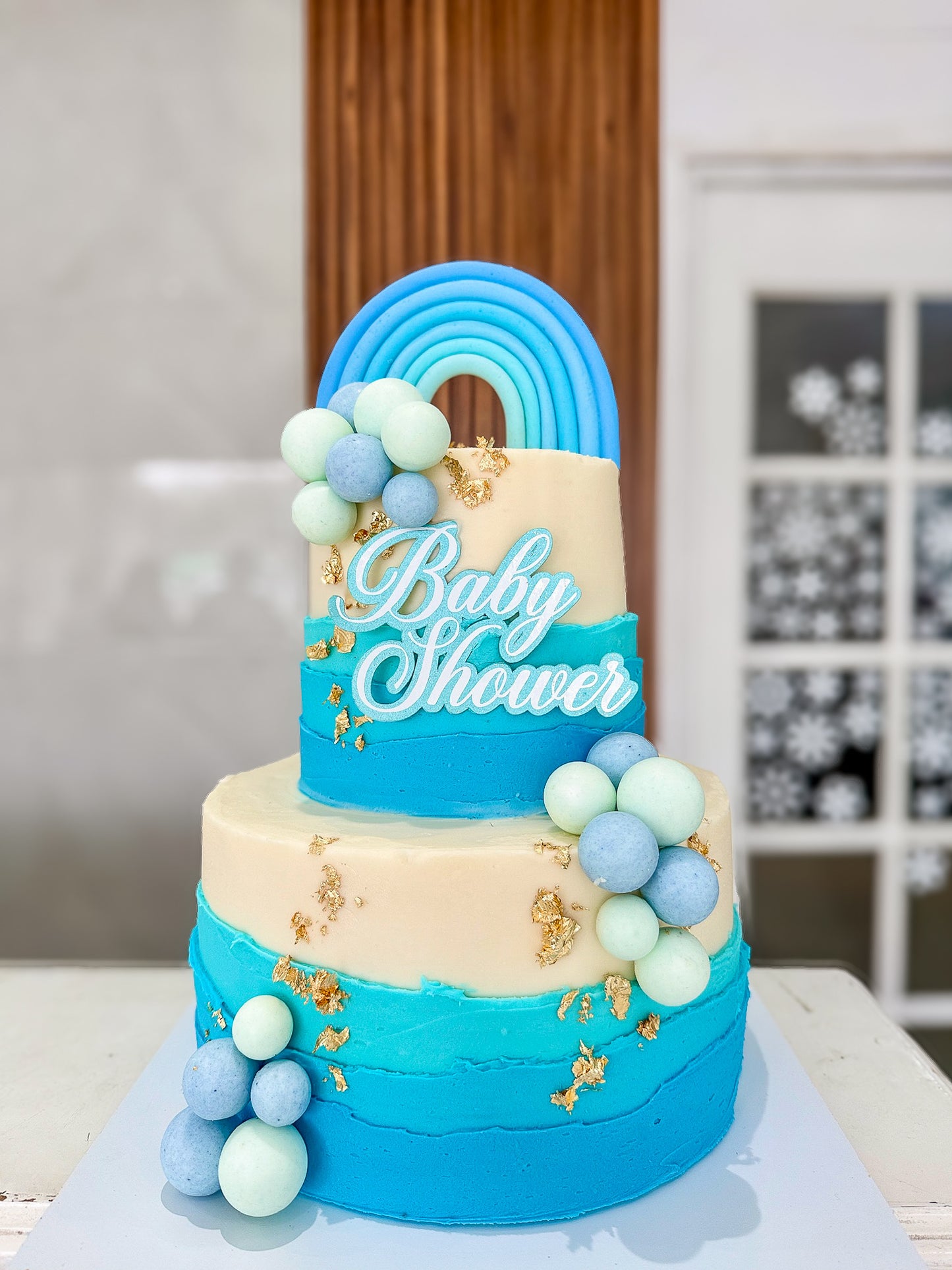 Un pastel moderno y tierno para celebrar la llegada de tu bebé. Este diseño de dos niveles para 30 personas destaca por su elegante combinación de tonos crema y azul, decorado con un arco iris en relieve, esferas en azul pastel, menta y celeste, y toques de lámina dorada comestible.