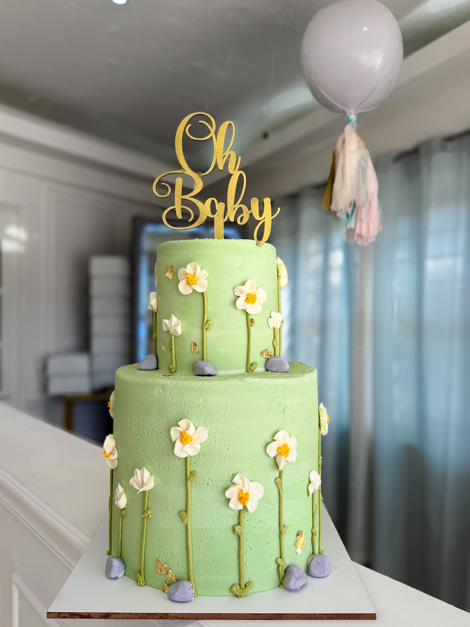 Celebra la llegada de tu bebé con un pastel de dos pisos elegante, fresco y lleno de vida. Su diseño en tonos verde menta, con flores blancas, piedras decorativas y detalles en hoja de oro comestible, lo convierten en el centro de mesa perfecto para un baby shower único y sofisticado.