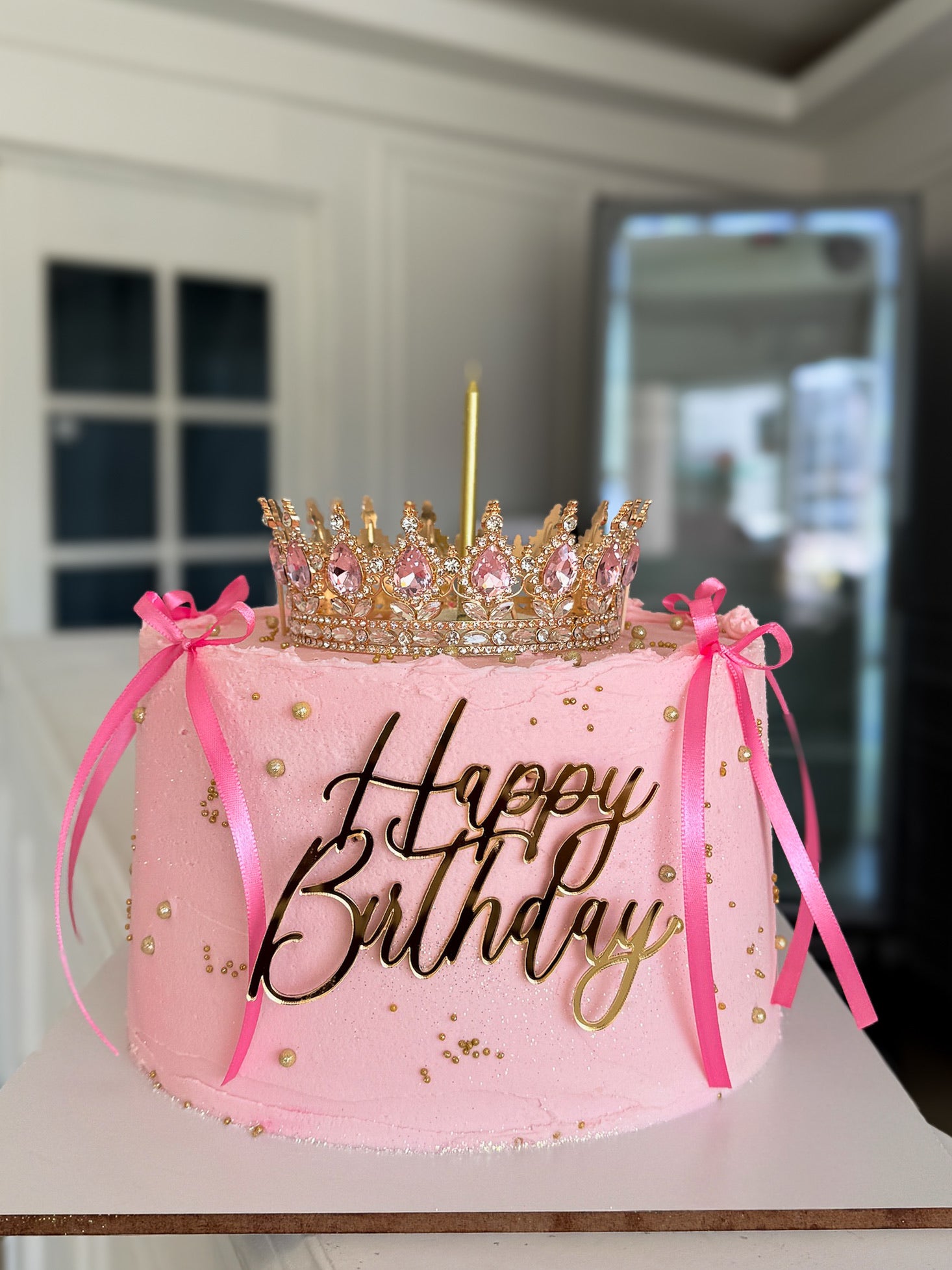 Diseño dulce y glamuroso en su máxima expresión. Este pastel para 20 personas está decorado con betún en tono rosa pastel, moños de listón fucsia, perlas doradas y un topper “Happy Birthday” en acrílico dorado. Como toque final, una corona dorada con incrustaciones rosas que lo convierte en un pastel digno de una princesa moderna.